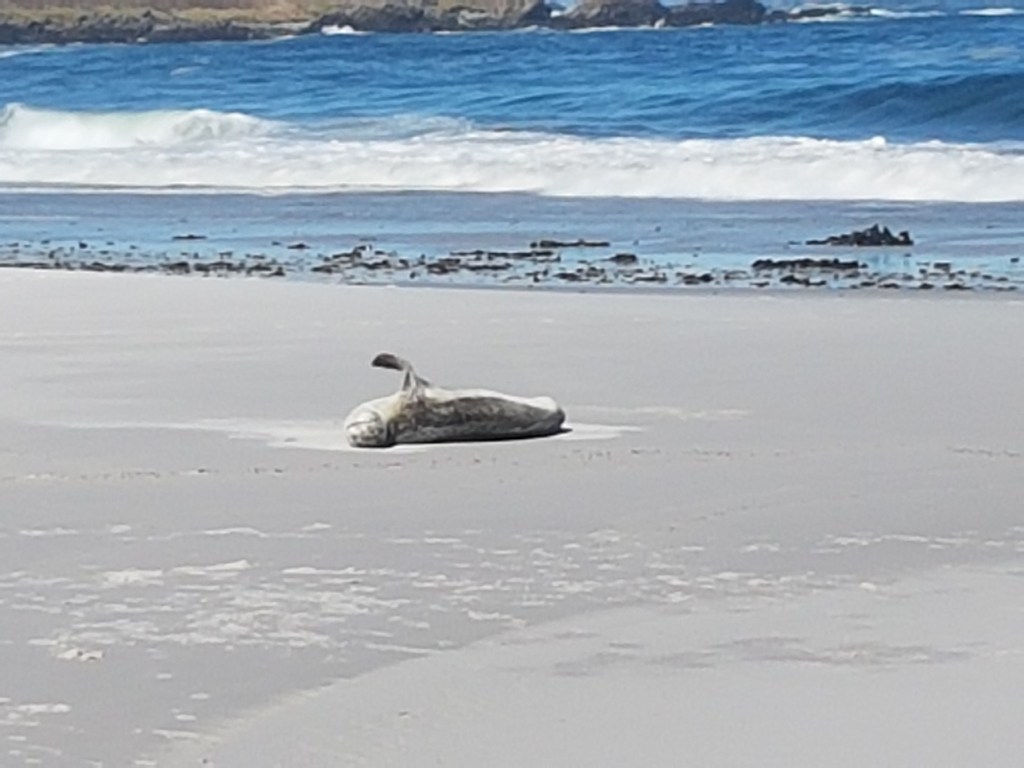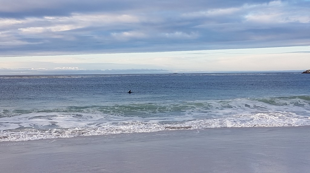 These past couple of weeks have seen a real shift in the weather; winter is on its way. The wildlife has reduced somewhat – there is definitely much less bird life around, however we have been pretty well entertained with the whales (Sei, humpback and southern right) and dolphins (Commerson and Peale) that have been seen in and around the beaches nearest to us; its crazy to think how close they are. I’ve gotten quite used now to going for my daily dog walk and seeing a group of dolphins playing about the waves, or seeing the blow of the whales on the horizon – very bizarre! Eldest Barlow was lucky enough to be part of a boat trip with the watch group that went out to look at the whales, and she had a fabulous time seeing them breeching and swimming so close to them.